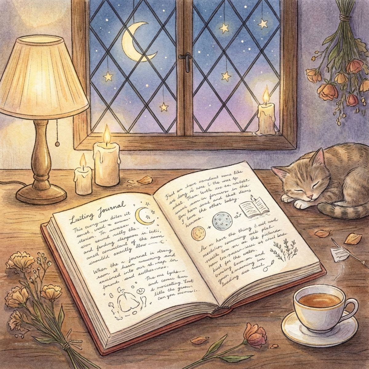Открытый дневник с размышлениями, луна видна в окне