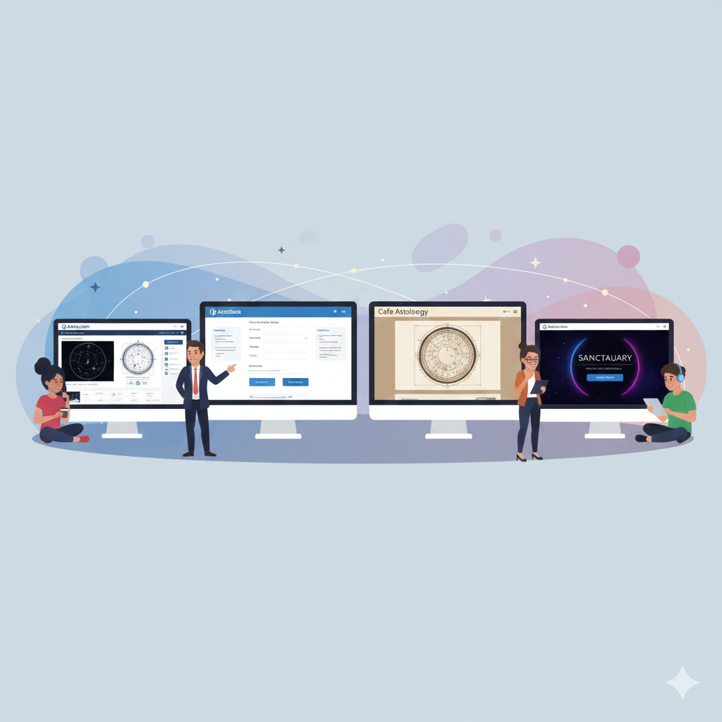 Макеты интерфейсов трёх сервисов (Astro.com, AstroSeek, Sanctuary) для наглядного сравнения дизайна и удобства
